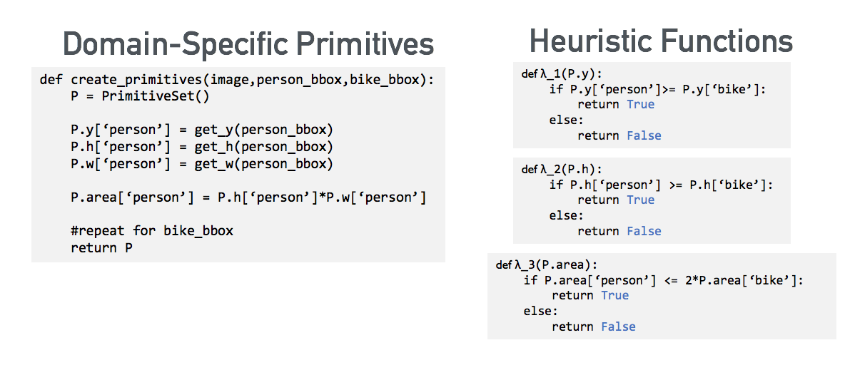 Re-purposing the outputs of existing pipelines, such as bounding boxes from object detectors, allows users to develop heuristics that encode complex relational information. For example, bounding boxes around all humans and bicycles in an image can help users write heuristics to determine whether there is a person riding a bike in a given image.