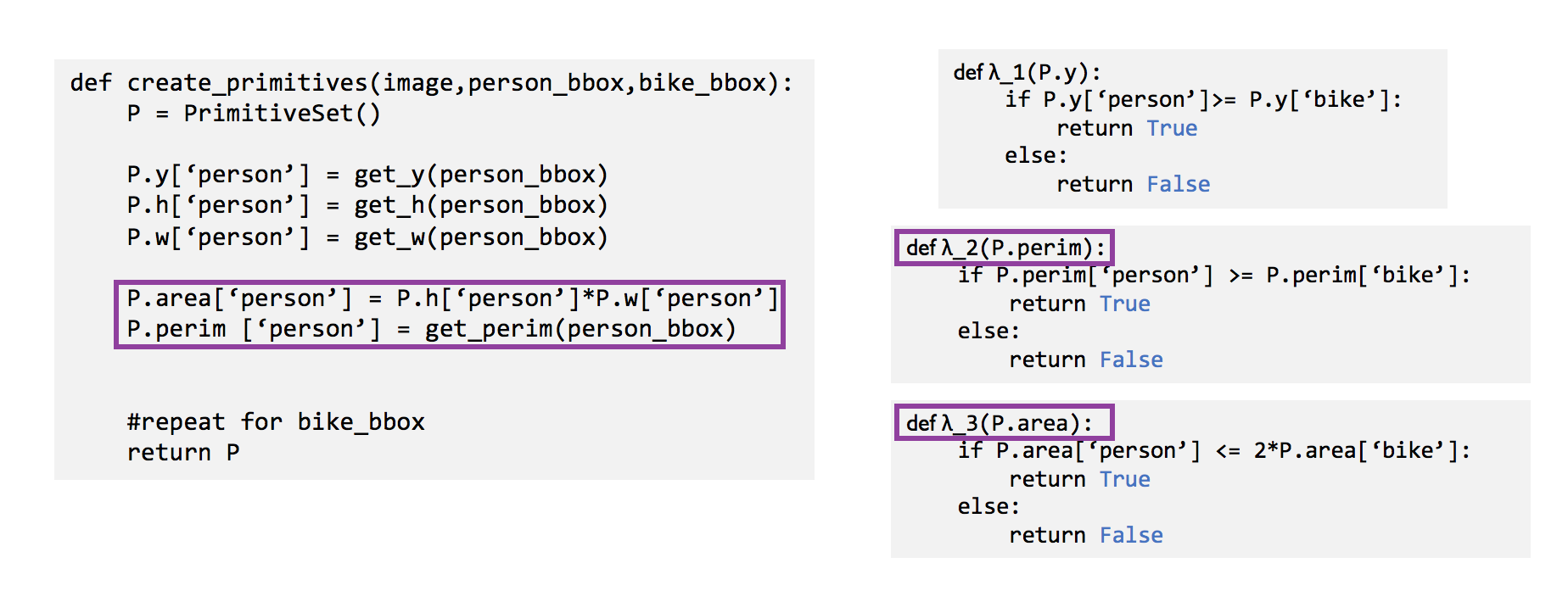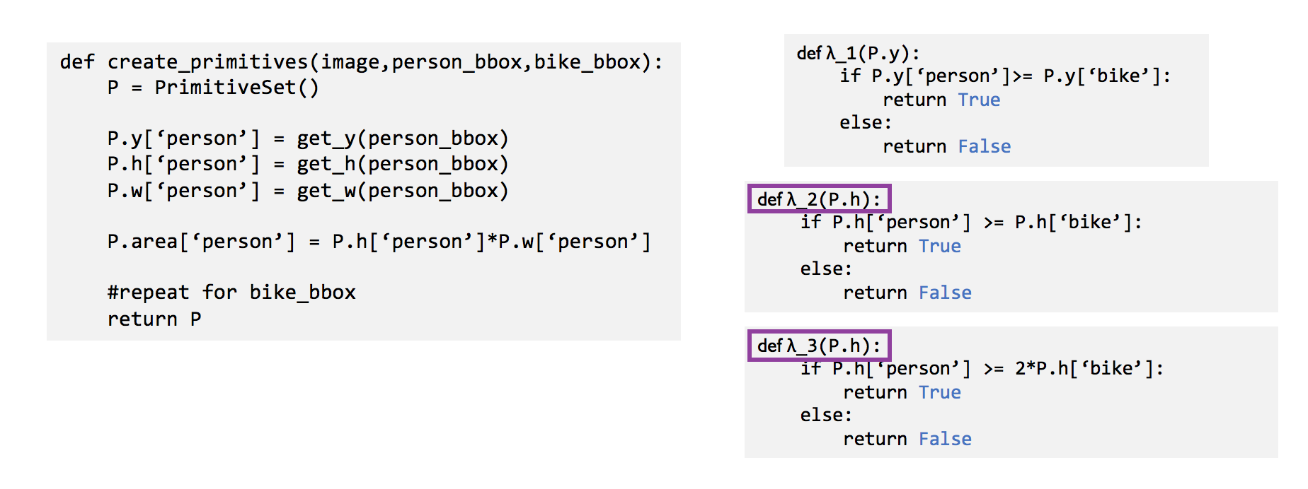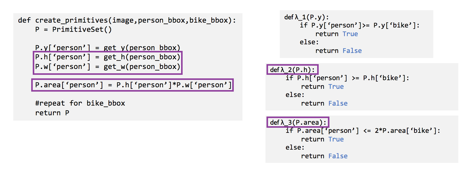 We use the programmatic nature of the heuristics and DSPs in order to infer, rather than learn, correlations. The simplest way to exploit the programmatic nature of the heuristics is to check whether they share primitives automatically using static analysis. In the example below, both the second and third heuristic functions rely on the height of the bounding boxes, denoted by P.h. We can simply look at the inputs to the functions and incorporate the dependency between the second and third labeling function in the generative model.