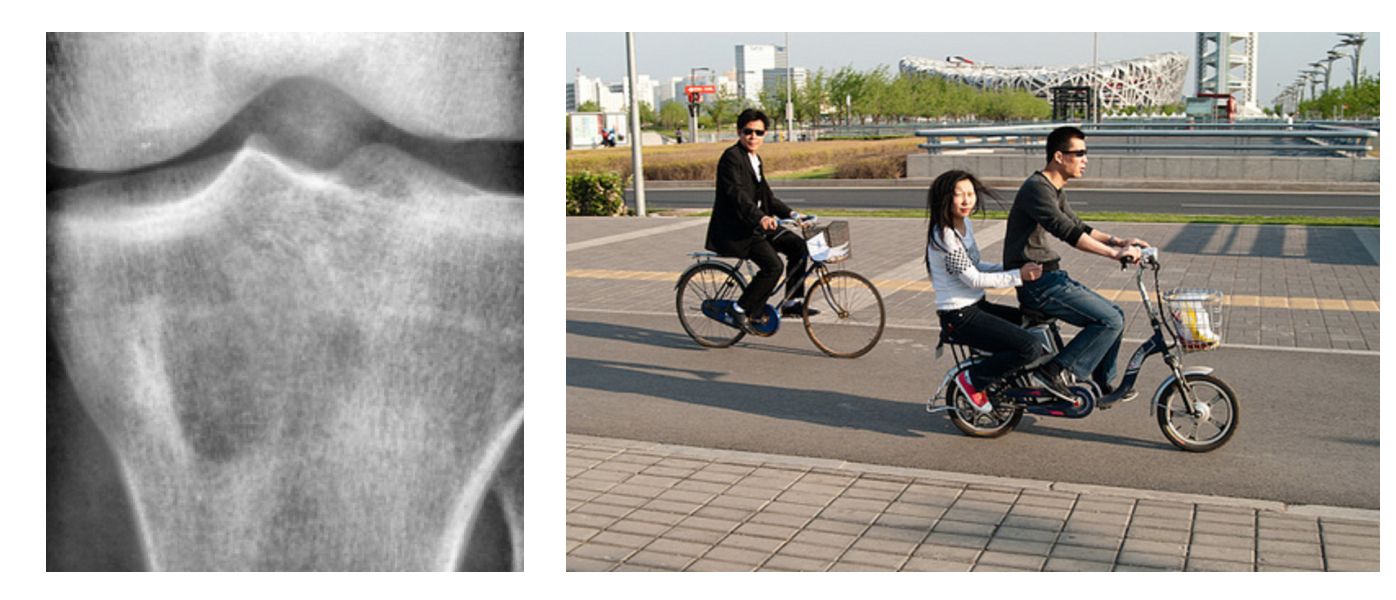 While weak supervision for text-based data can come from rules that rely on complex regex patterns or parts-of-speech, describing non-text data such as video and images in a similar manner is challenging. For example, describing the size of the dark patch in the X-ray image below or counting the number of bikers is difficult via heuristics that only have access to the raw pixel values.