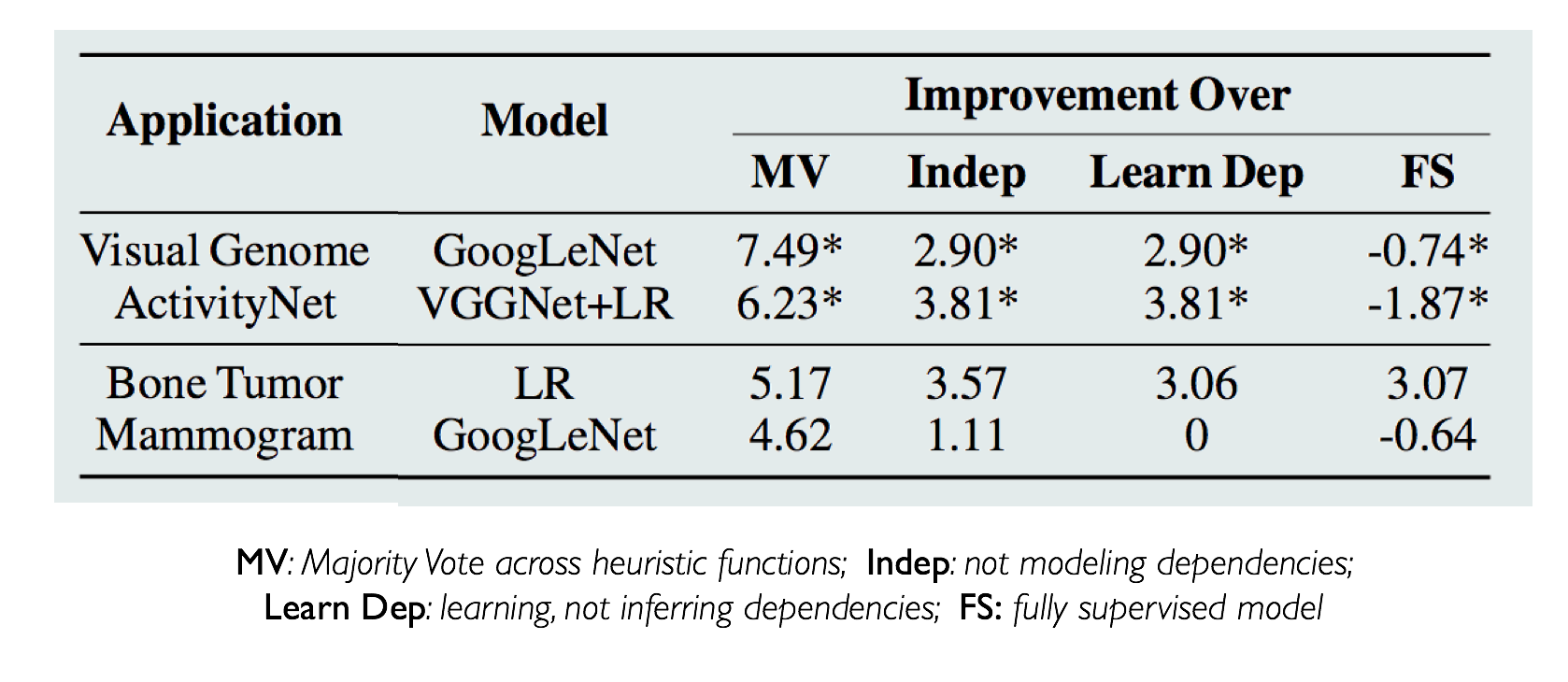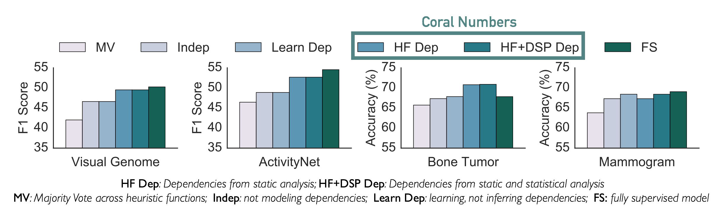 We apply Coral to a variety of image and video data, including natural and radiology images. Details about the data sets and specific results are included in the paper. For each task, we compare the performance of a discriminative model, like GoogLeNet, trained on labels generated by ground truth training labels (FS), majority vote (MV) across heuristics, a model that assumes independence (Indep) among the heuristics, and one that learns correlations (Learn Dep) instead of inferring them. Within the Coral paradigm, we split results by whether the dependencies only relied on heuristic correlations or also learned DSP correlations.
