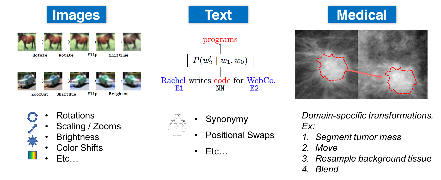 Modern machine learning models, such as deep neural networks, may have billions of free parameters and accordingly require massive labeled training sets—which are often not available. The technique of artificially expanding labeled training sets by transforming data points in ways which preserve class labels—known as data augmentation—has quickly become a critical and effective tool for combatting this labeled data scarcity problem. And indeed, data augmentation is cited as essential to nearly every state-of-the-art result in image classification (see below), and is becoming increasingly common in other modalities as well.