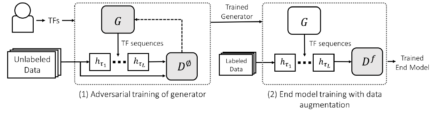 In our proposed system, users provide a set of arbitrary, black-box transformation functions (TFs)—representing incremental transformation operations, such as “rotate 5 degrees” or “shift by 2 pixels”—which need not be differentiable nor deterministic, and an unlabeled dataset. We then automatically learn a generative sequence model over the TFs using adversarial techniques, so that the generated transformation sequences produce realistic augmented data points. The generative model can then be used to augment training sets for any end discriminative model.