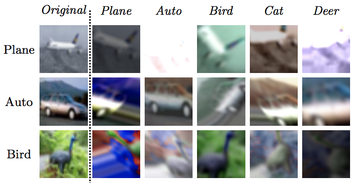 We demonstrate the intuition behind this modeling assumption in the above figure by taking images from CIFAR-10 (each row) and searching for transformation sequences that map them to different classes (each column) according to a trained discriminative model. We see that the transformed images do not look much like the class they are being mapped to, but often do look like garbage.