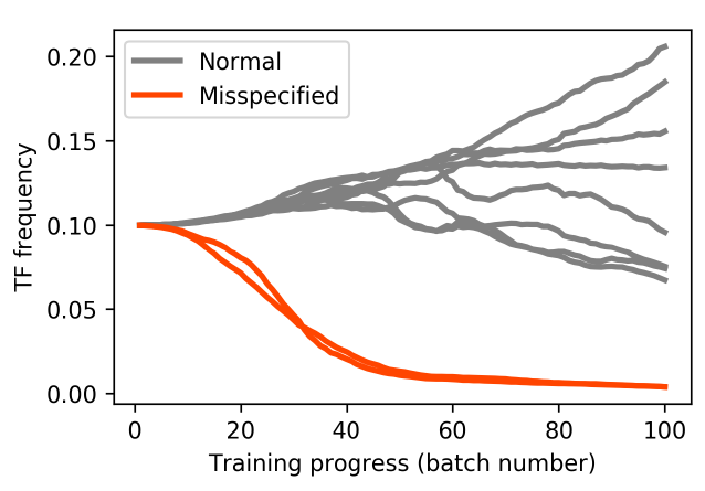 We also investigated the robustness of our method to buggy or poorly specified TFs by intentionally including some in the MNIST pipeline. The probability of applying each TF (the “TF frequency”) as learned by the mean field model, as training progresses, are shown in the figure below. Importantly, we see that the model learns to avoid applying the misspecified TFs!