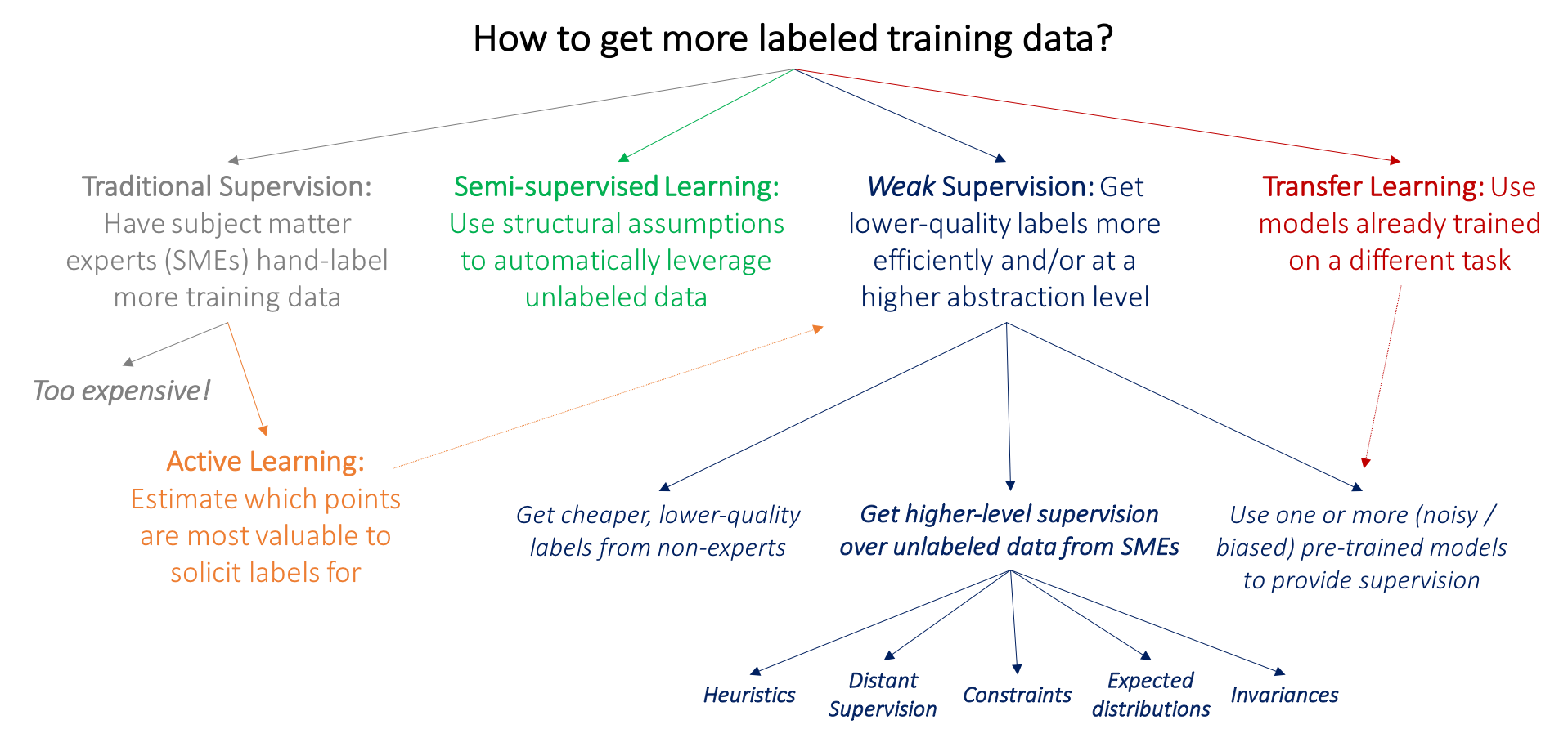 The above paradigms potentially allow us to avoid asking our SME collaborators for additional training labels. But what if–either in addition, or instead–we could ask them for various types of higher-level, or otherwise less precise, forms of supervision, which would be faster and easier to provide? For example, what if our radiologists could spend an afternoon specifying a set of heuristics or other resources, that–if handled properly–could effectively replace thousands of training labels? This is the key practical motivation for weak supervision approaches, which we describe next.